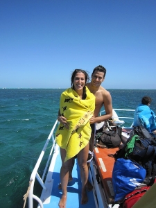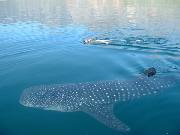 Fort heureusement, le capitaine du Kashi-Mar, dix-huit ans d’expérience le long de cette côte, aidé de son équipage aussi jeune que compétent, savait exactement comment nous nous sentions. Ils nous ont progressivement mis « dans le bain ». Kamis, Luis et moi avons mémorisé les signaux de détresse, étant entendu que même les nageurs les plus robustes peuvent se fatiguer à poursuivre les plus grandes créatures marines du monde, et qu’il n’est pas indigne de lever le bras pour demander de l’aide. Nous serions très proches, nous a-t-on dit, mais il ne fallait pas toucher les animaux ou se laisser toucher par eux. Une tape amicale de requin baleine peut vous assommer et vous faire sortir brutalement de votre zone de confort.