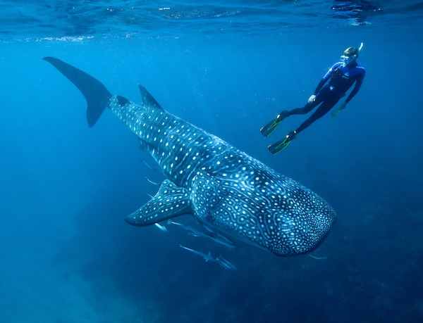 S’émerveiller du gracieux mouvement de sa queue lorsqu’il se propulse sans effort hors de l’océan. Nous ne sommes qu’à quelques mètres de la surface et le soleil joue à travers l’eau, on dirait que ses rayons viennent vers nous, comme d’une source provenant des profondeurs de l’océan. C’est le monde des requins baleines, et nous faisons corps avec lui.