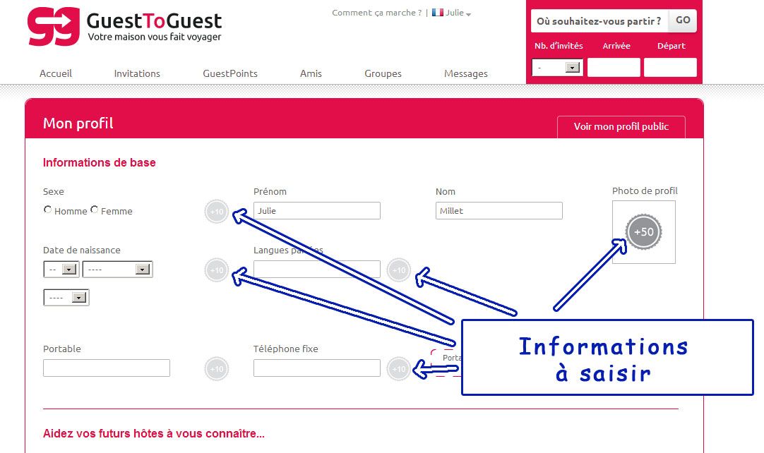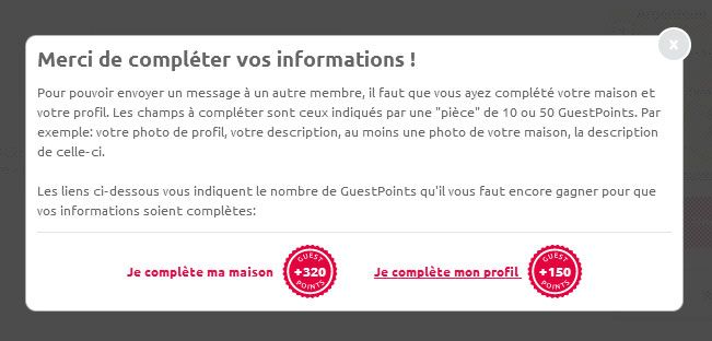 Pour le profil de la maison, n’oubliez pas de cliquer sur tous les onglets.Il vous suffit alors de saisir les informations(*) demandées. Vous gagnerez des GuestPoints et surtout vous augmenterez vos chances que les membres que vous contactez aient envie de vous prêter leur maison.