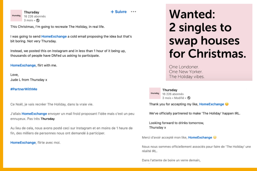 Flirter… et s’associer pour faire de ce Noël 2021 un Noël encore plus magique en recréant The Holiday “dans la vraie vie” ! Car qui de mieux pour ce faire qu’une application de rencontres et le premier site d’échange de maison au monde, qui a permis à Cameron Diaz de rencontrer Jude Law ?