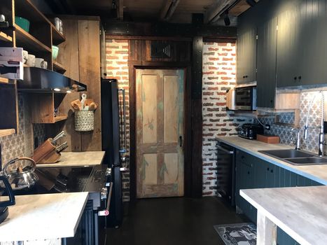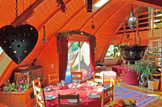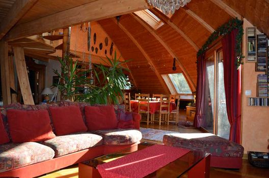 Les murs massifs de ce chalet sont isolés avec des bottes de paille recouvertes à l’argile et à la chaux. L’objectif : être au chaud en hiver et au frais en été. Les matériaux artisanaux qui composent le lieu ont été choisis pour minimiser l'empreinte écologique : paille, argile et chaux mais aussi bois récupéré, et briques provenant d’une ancienne usine voisine.