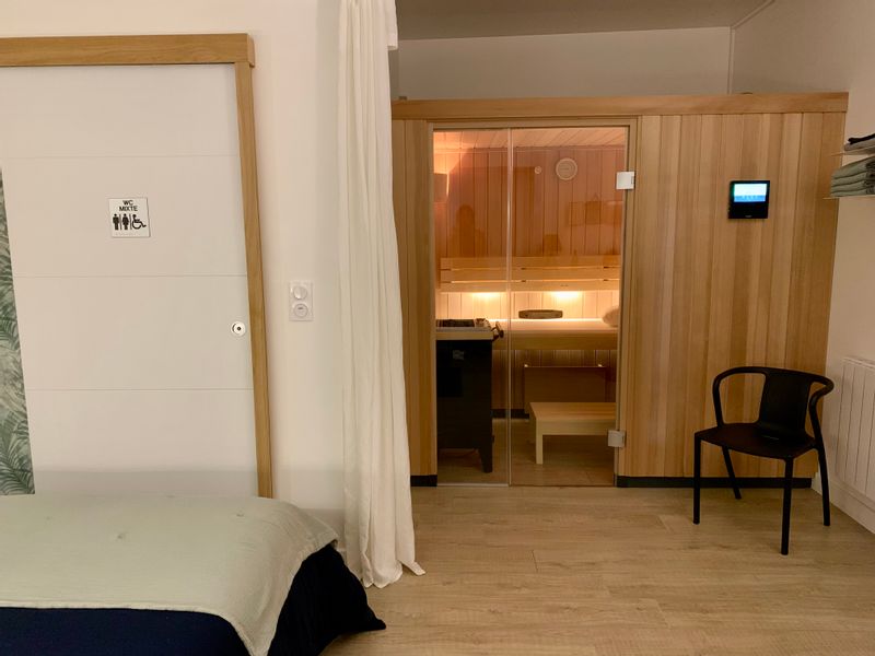 Chambre indépendante avec SDB privée + sanarium (mix entre sauna et hammam) et fauteuil de massage