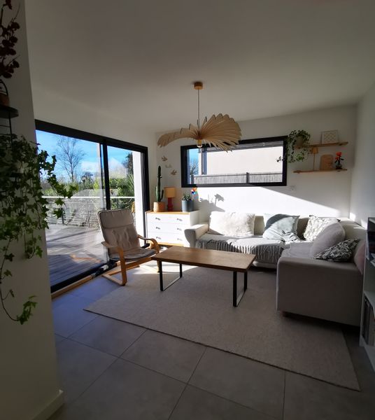 Maison moderne avec terrasse, jardin et vue sur la nature