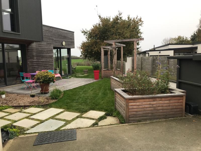 Maison contemporaine avec terrasse, espace jardin et potager.