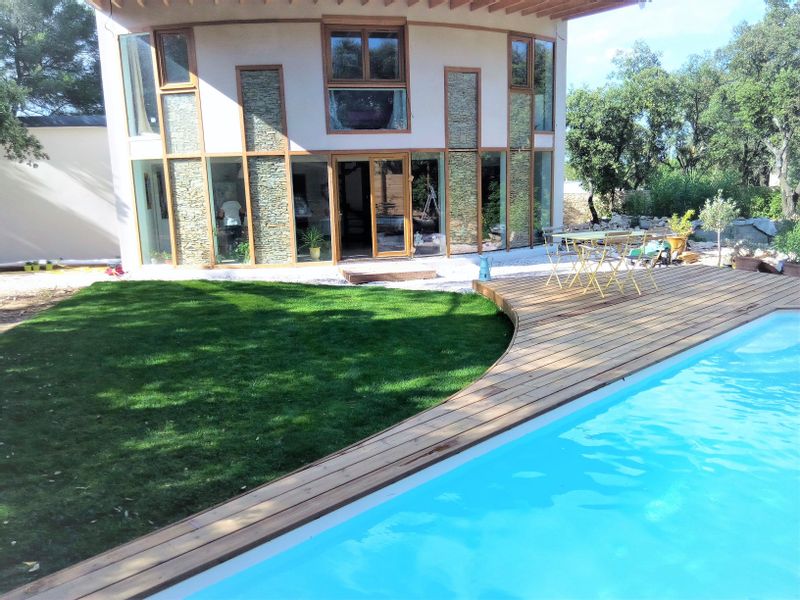 Une maison bioclimatique dans un grand jardin avec piscine