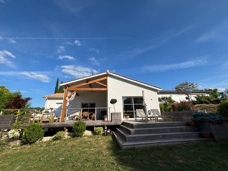 Maison neuve pleine de charme, terrasse bois, vue jardin et piscine au calme avec commerces à pied.